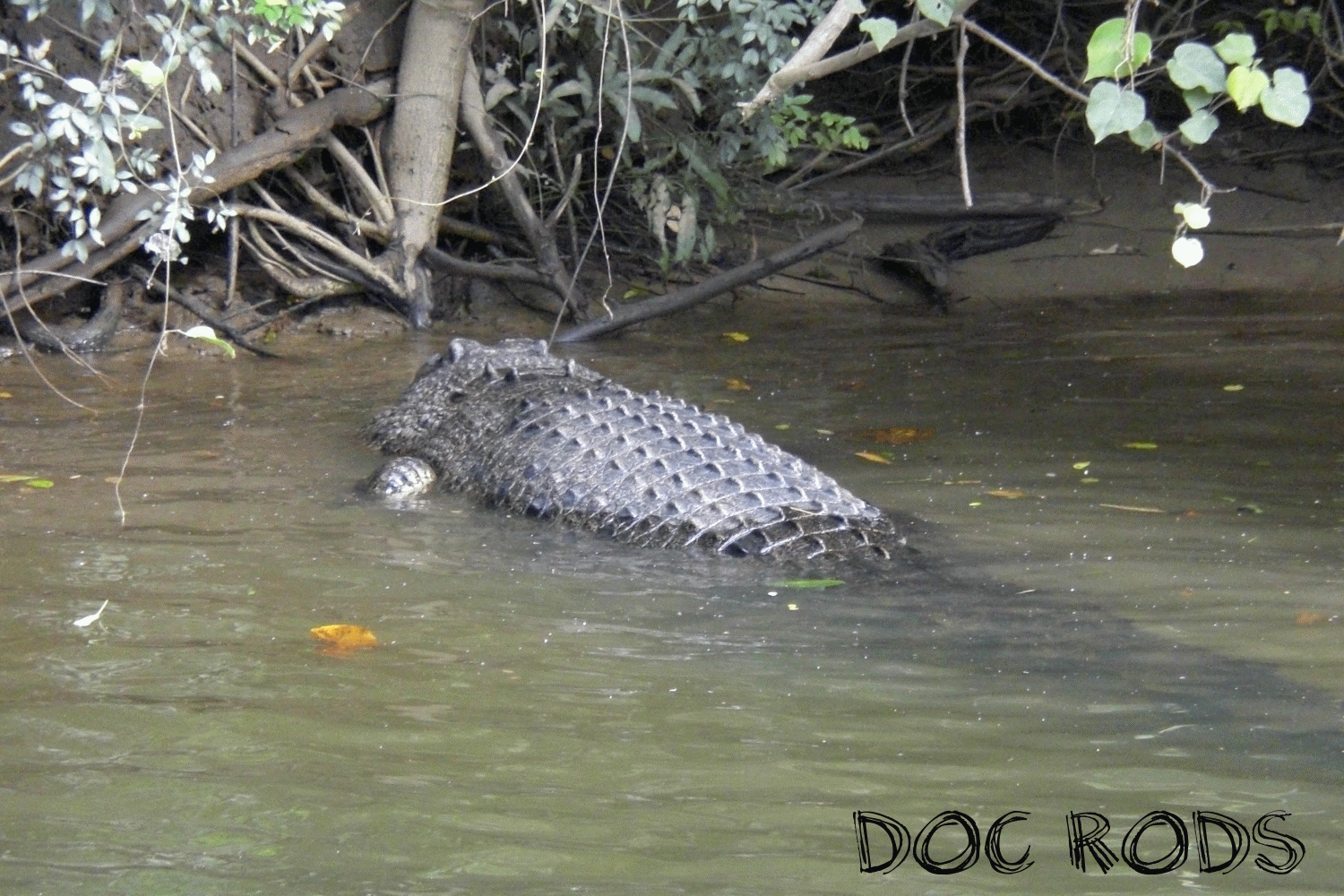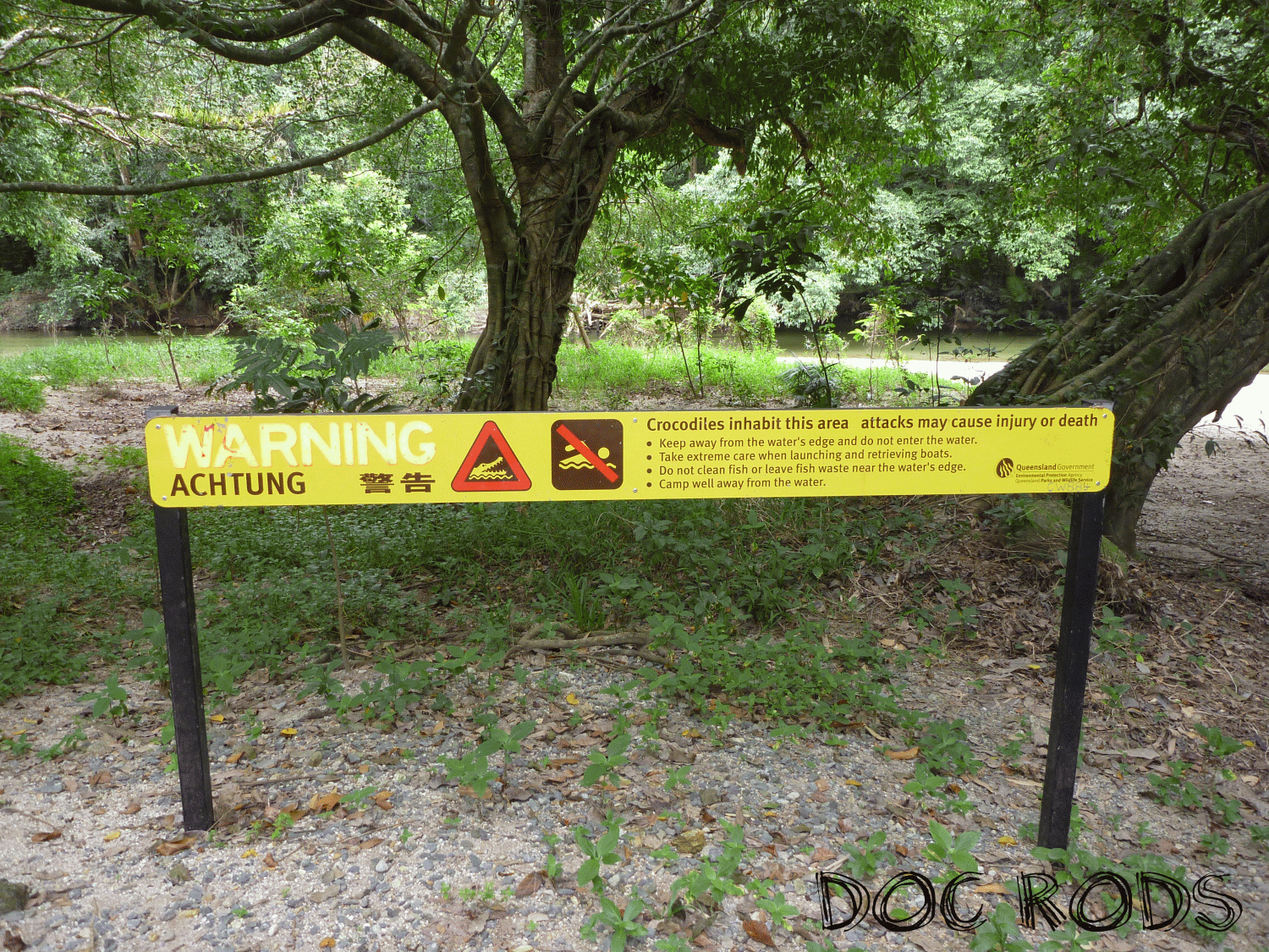 Mit dem Mietwagen ging es erstmal Richtung Norden. Ziel war der Daintree National Park ca. 1-2 Autostunden von Cairns entfernt. Auf dem Weg dorthin überquerten wir eine Vielzahl von Flüssen, die alle für mich randvoll mit Barramundis zu sein schienen. Interessant war vor allem die Gewässerbeschaffenheit. Einige waren trüb durch die lehmrote Erde und einige, kurioser Weise direkt daneben gelegen, waren glasklar. Das hier die Uhren ein wenig anders ticken, wurde mir klar, als ich versuchte ans Wasser zu gelangen. Das sollte man wirklich nur tun, wenn man sich auskennt, da es in fast jedem küstennahen Fluss Salzwasserkrokodile gibt. Und mit denen ist nicht gut Kirschen essen, schließlich werden diese Fressmaschinen über 5 Meter lang und über eine Tonne schwer!!! Dies verraten überall aufgestellte Warnschilder. Vom Ufer fischen ist zu also gefährlich und hatte sich somit erledigt.