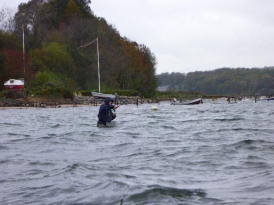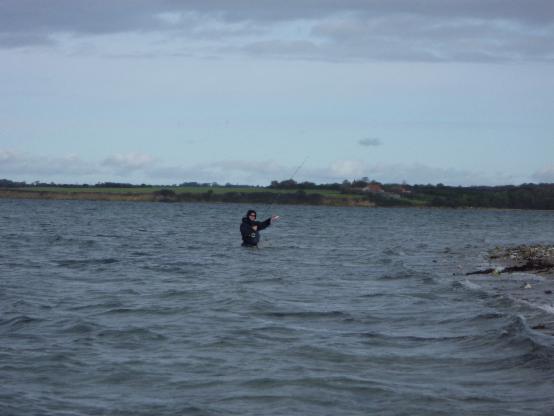 Zunächst hatten wir uns Fünen, genauer Baring Vig auf der Westseite, für unsere erste Stippvisite ausgeguckt. Fünen im Herbst ist immer eine Bank und da geht immer was. Wind von West und leicht bewölkter Himmel machten einen viel versprechenden Eindruck. Nach 2 Stunden ohne einen Anfasser, Nachläufer oder irgendeiner Oberflächenaktivität entschlossen wir uns zu einem Standortwechsel. Auffällig war auch, dass sehr wenig Nahrung im Wasser unterwegs war. Es ging wieder zurück nach Jütland um sich doch noch mal die ein oder andere Stelle am Kolding Fjord vorzunehmen. Bei dem drohenden Nordwind entschieden wir uns zuerst für das Nordufer, kamen aber bei der Besichtigung des Fjordes zu dem Schluss, dass wir das aufziehende schlechte Wetter ruhig am Südufer in Kauf nehmen wollten. Gesagt getan ging es wieder hoch motiviert ans Werk. Auch gestaltete sich die Fischerei als nicht gerade einfach. Der Wind frischte zunehmend auf und machte die Fischerei immer ungemütlicher. Gut war allerdings das der Wind von der Wurfhand weg kam und somit das Werfen kaum kompromittierte. Und tatsächlich war hier etwas mehr los. Natürlich stürzten sich die Trutten nicht auf die Fliegen. Aber immerhin bekamen wir den ein oder anderen Anfasser. Und selbst unter den härtesten Bedingungen mit 5-6 Bft in your Face ging etwas.