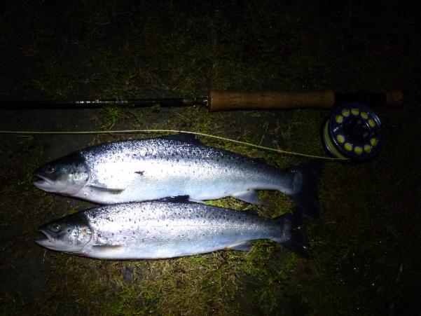 Zum Begiessen ein Schlückchen Single Malt einen edlen Zigarillo. Und weiter ging’s... Wenig später bekamen wir einen weiteren Biss doch konnten den Fisch leider nicht haken. Das war ein Auftakt nach Maß. Wir fischten bisher erst knapp 90min und waren schon hoch zufrieden. Es nieselte/regnete unaufhörlich doch das hat unsere Laune nur verbessert. Nach einem leckeren Abendessen über Cornys mobilem MSR Brenner am Fluss ging es weiter. In unserem zweiten Frame lächelte uns ein super Pool an. Nach einigen wenigen Würfen wurde die kleine Green Highlander Tube heftig attackiert und einige Sekunden später schraubte sich ein guter 3-4kg blitze-blanker Fisch aus dem Wasser. Wahnsinn!!! Nach einigen weiteren Sprüngen dachten, wir, dass der Spuk schon vorbei sei. Der Haken saß super. Doch plötzlich ohne erkennbaren Grund schlitzte der Haken aus.